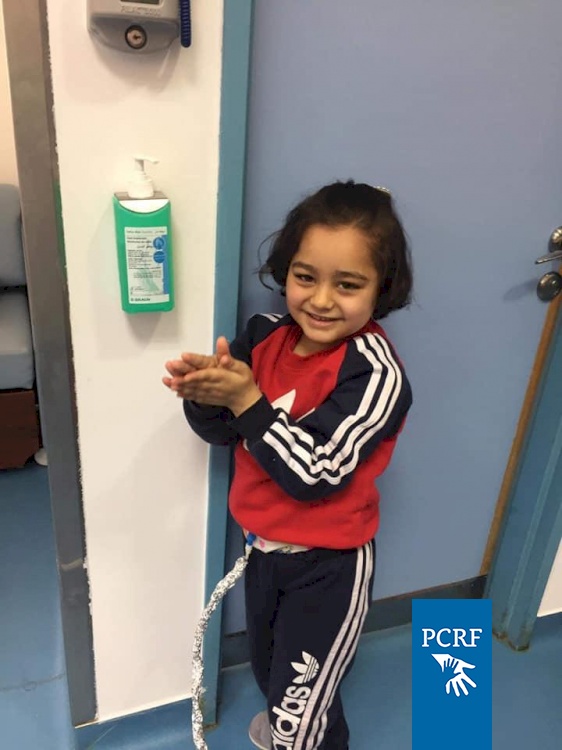 This week we provided 200 bottles of hand sanitizers to the Huda Al Masri Pediatric Cancer Department in Biet Jala Hospital to help protect patients, their families and the staff from infection and the Covid-19 virus, which broke out in Bethlehem earlier this month. Five-year-old Batool from Hebron cleans her while in the department fighting leukemia. These are the most at-risk children in Palestine due to their weak immune systems and PCRF is working to provide them protection during the global pandemic.