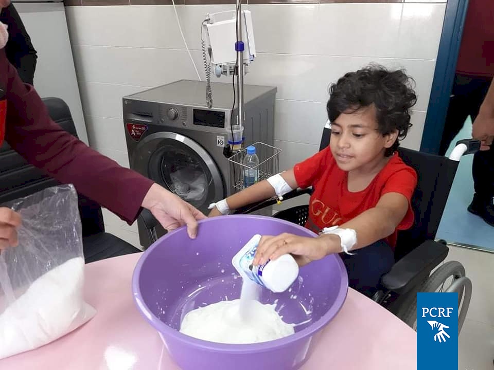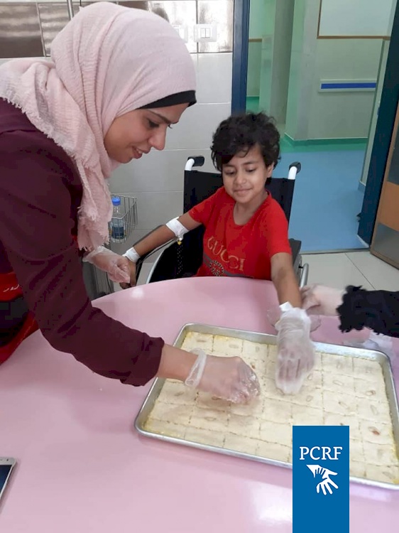 Providing children who are fighting cancer in Gaza child-life activities while they undergo difficult medical care is an important part of their treatment. This week, 7-year-old Saja from Rafah on the Egyptian border, while being treated for leukemia, helped to make "basbosa" and helped our social workers in preparing it from semolina, coconut and yogurt. She then helped to distribute this to other kids being treated in the department. Thanks to our supporters all over the world, who enable us to have a Child-Life program in our two cancer departments to help patients learn developmental skills and participate in activities like any normal Palestinian child.