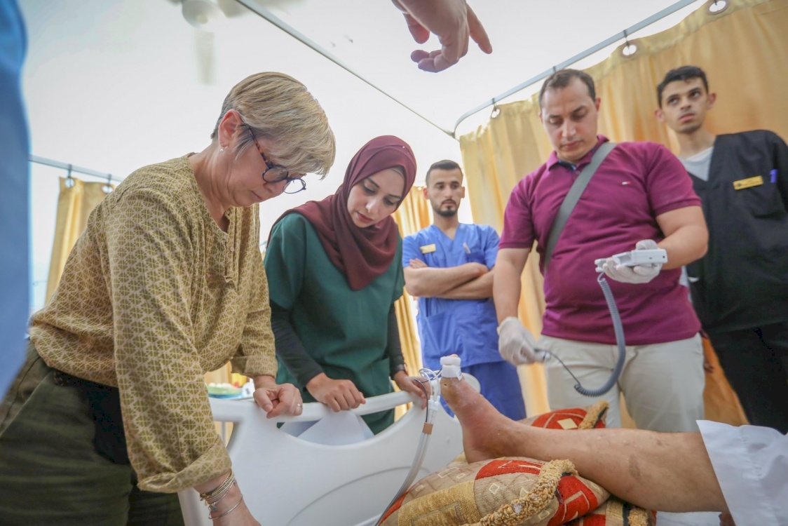 Dermatologist Dr. Patricia Senet from Paris is on her first volunteer medical mission with PCRF. She is working with the local team to treat patients with her experience in treating diabetic wounds and bed sores at the European Gaza Hospital in the southern Gaza Strip. PCRF volunteer medical missions work to develop and train local medical staff in Palestine while giving children the medical relief they need and deserve, that they otherwise could not receive locally.