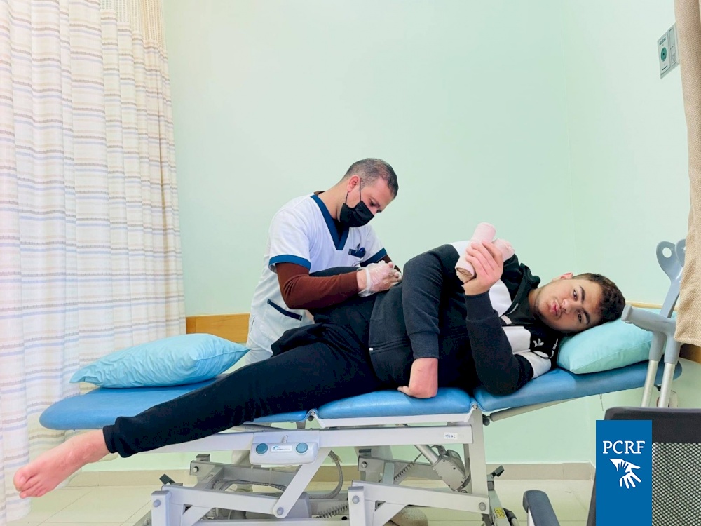 In 2014, Thaer was just a nine-year-old boy when a bomb struck his home during the war on Gaza, killing his mother, four siblings, and taking his leg. PCRF sent the injured boy twice to the Shriners Hospital in Portland, Oregon for surgery and a prosthesis. Thanks for our PCRF Portland chapter, he got the care he needed to go home and return to school and his surviving family. He is now sixteen-years-old. and we continue to support his treatment through our Gaza Amputee Program, which includes getting him adjustments and care at Hamad Hospital in Gaza City. As Thaer grows, his body changes and the need to adjust his prosthetics changes as well. He was transferred to the PT to prepare his stump and take measurements later to make a new socket soon. Thaer sends his regards to all the PCRF volunteers who have been instrumental in his care over the past seven years.