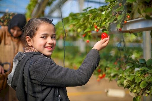 The PCRF organized a trip for amputee children and youth to a strawberry farm in the northern Gaza Strip in support of their social, emotional, and mental health development. This trip included various fun activities meant to support mental and emotional health, which included a tour of the farm's plants and flowers, helping farm staff with strawberry picking, playing, and of course, eating!